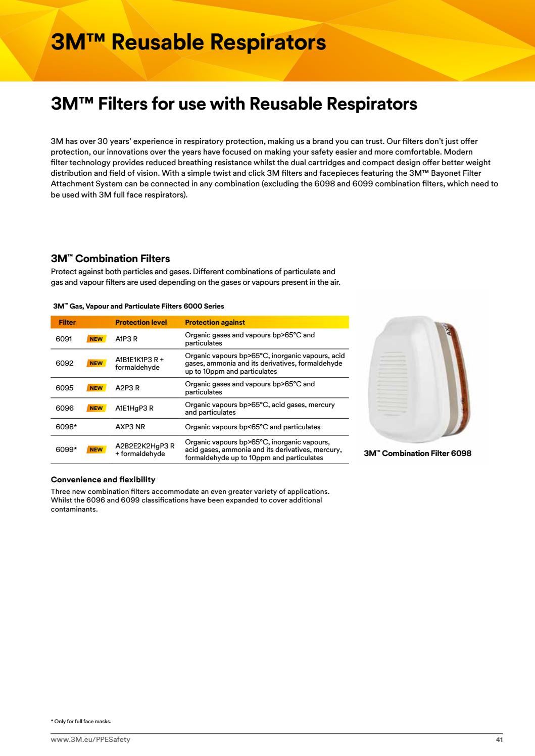 Versatile, ergonomic, and simple to install: designed to enhance field of view and comfort on the job, these gas, vapour and particulate filters feature a low-profile, swept-back design. 3M Bayonet Gas, Vapour and Particulate Filters are easy to install. Simply choose the filter type that's suitable for your individual needs and requirements, align the connection and twist to lock into place with a quarter turn.These filters are compatible with 3M Reusable Half Facepieces 6000 Series, 6500QL Series, 7500* Series and 3M Reusable Full Facepieces 6000 Series and Ultimate FX FF-400 Series, thus helping to reduce inventory needs. Easy breathing: 3M Bayonet Gas, Vapour and Particulate Filters are designed to balance breathability and long service life. Gas and vapour filters use carbon particles to adsorb contaminants, filtering the air that you breathe. 3M has designed the filters to be easy to breathe through and long lasting by optimising the layers and depth of the carbon bed, geometry of the filter body, and carbon particle size. 3M Bayonet Gas, Vapour and Particulate Filters provide protection against a wide range of gases, vapours and particulates. Designed for use in multiple industrial applications. Help protect your workforce: 3M offers a free online tool to help you select the appropriate respirators and filters for your workplace respiratory hazards and contaminants and help determine filter change-out schedules. 3M Select and Service Life Software (www.3M.com/sls) contains more than 700 different chemicals and provides documentation of your choices. 3M Bayonet Gas, Vapour and Particulate Filters comply with AS/NZS 1716:2012 (Respiratory protective devices) to protect against a wide range of gases and vapours depending on the model selected. *6098 and 6099 are not suitable for use with half facepiece respirators. Not for use in environments that are immediately dangerous to life or health (IDLH) Change 3M Bayonet Gas, Vapour and Particulate Filters in accordance with your well-documented change-out schedule or earlier if smell, taste or irritation from contaminants is detected.