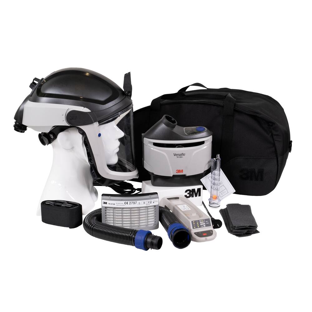 The 3M Versaflo CAPM-307C Integrated Powered Air respirator Ready-to-go Kit includes, TR-315A+ PAPR starter kits and M-307 Helmet (Flame Resistant Faceseal) with reflective tape, M-940 Cap Lamp Bracket, TR-302E+ Air filter unit, BT-30 Breathing Tube, TR-970 Air flow indicator, TR-332 Battery Pack, TR-341A Single station Battery charger, TR-3712E PAPR-P3 Particulate filter, TR-371+ Filter and cover, TR-3600 Prefilter, TR-362E Spark arrestor, TR-325 Standard waist belt in padded storage bag (S1303-0166).