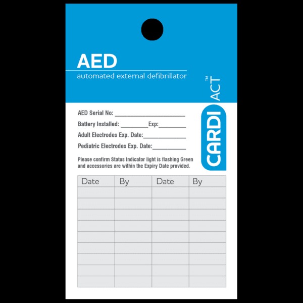 The CardiAct AED Test Tag provides a tear resistant vinyl tag for recording AED inspections and testing.