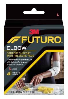 Designed with strategically placed pads, the FUTURO Comfort Elbow Support with Pressure Pads delivers targeted pressure to your injured tendons. This comfortable, elastic knit elbow support is low profile and flexible for natural range of motion and an undetectable fit underneath clothing. Breathable properties help keep you cool and the sleeve design is so easy to put on and take off. Reach for the reliable support of the FUTURO Comfort Elbow Support with Pressure Pads while participating in the activities you enjoy most.