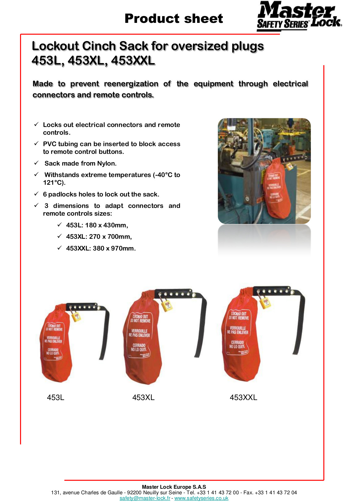 The Master Lock No. 0453XL Extra Large Nylon Oversized Plug & Control Cover features a 254mm diameter x 660mm tall flexible and durable rip-stop nylon bag that fits easily in safety tool boxes. Effectively locks out odd size and large electrical connecters and hoist controls and accepts up to 6 padlocks or hasps. Insert PVC tubing to block access to hoist control buttons.