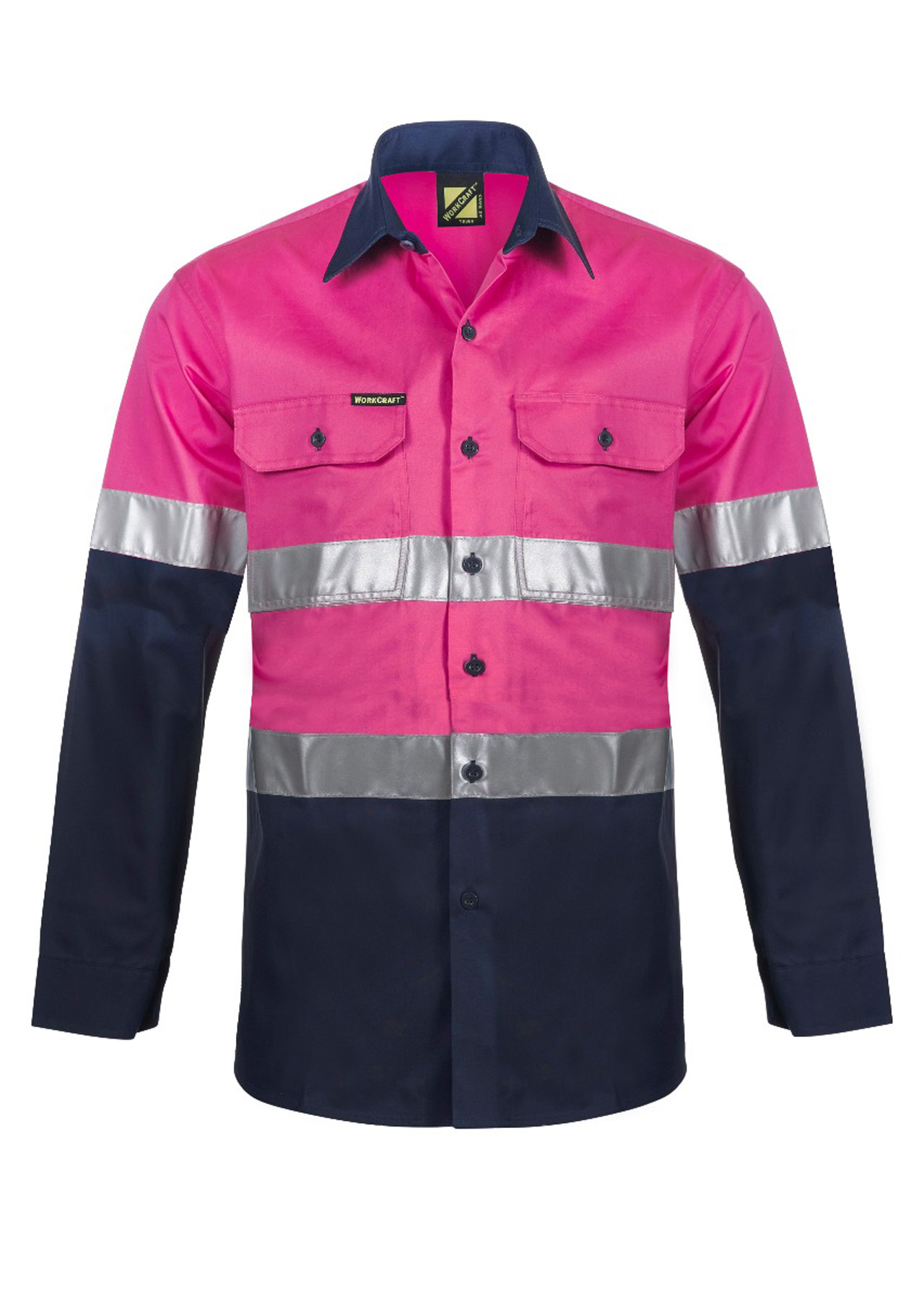 Workcraft Lightweight Long Sleeve Vented Cotton Drill Reflective Shirt - Night Use Only (Navy/Pink)